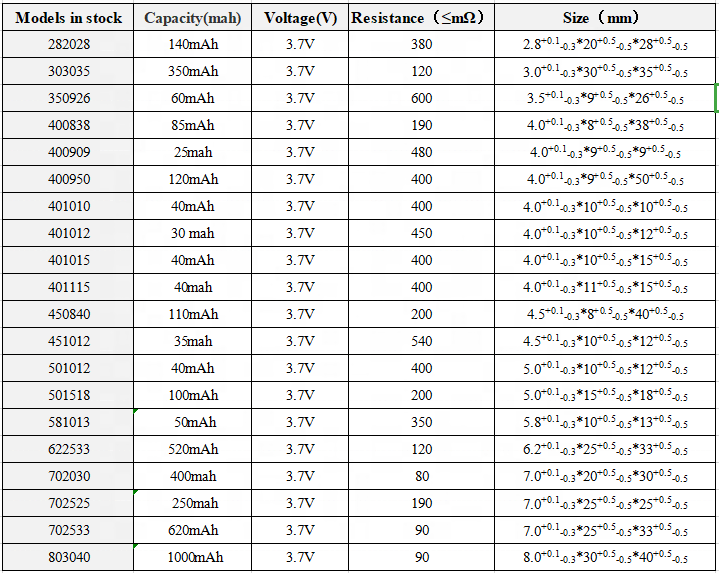 د محصول نوم | 581013 3.7V 50mAh پولیمر لیتیم بیټرۍ | څرګندونه | |